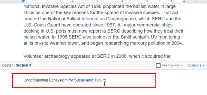 - From the footer options that appear, make sure to uncheck the “Link to previous” option. This will set your footer to behave as a separate document – you can format it any way you want.