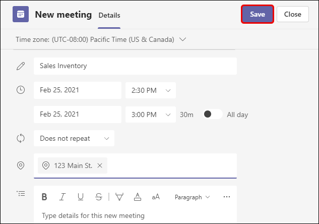 - Add all the meeting details, including name, attendees, or change the time if necessary.