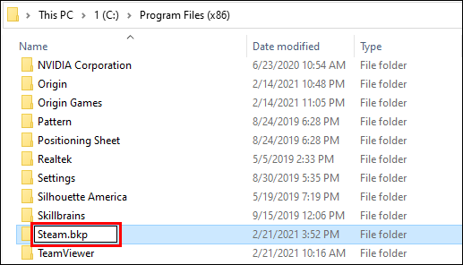 - Rename your old folder into Steam.bkp and let it stay in the directory. It can serve as a backup, or you can delete the folder later.