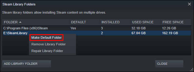 - To designate a drive as the default library location for your games, right-click on the new folder location and choose the “Make Default Folder” option from the menu.