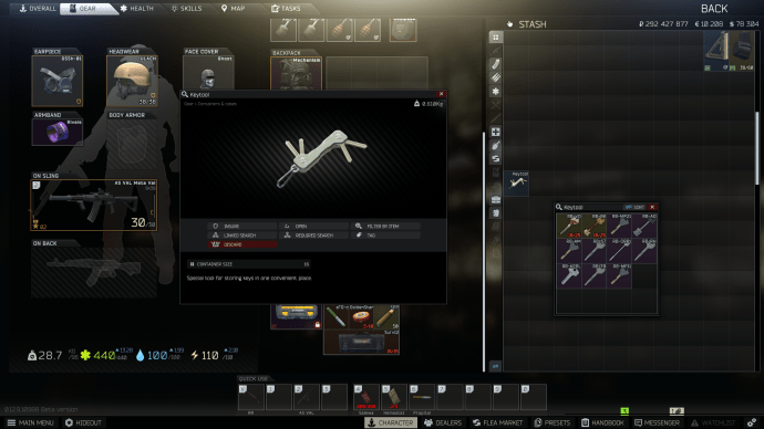 - Keytool: as one of the smallest containers, it can hold 16 keys in a single inventory slot. You can buy it from the level 2 Therapist by giving away ten bottles of hydrogen peroxide and saline solution each, as well as ten packs of chlorine.