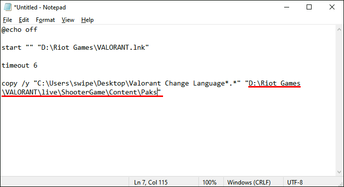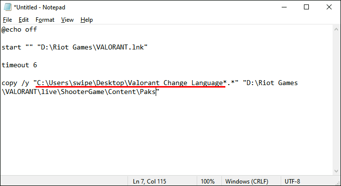 - There’s only one line of text left to replace, and that is “your Valorant game directory”. Replace it with the path from step 3. The path should look something like this: