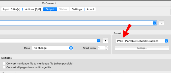 - Head to the “Output” section and pick PNG as the output format. You can press the “Settings” button below to modify the output quality.