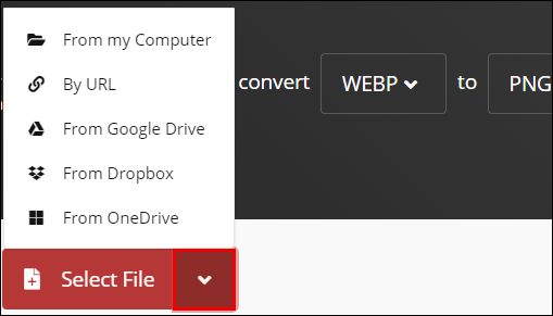- Press the down-pointing arrow next to the “Select File” tab and choose whether you want to use an image from your computer, Google Drive, Dropbox, OneDrive, or paste a URL.