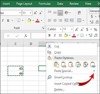 - Place your cursor on the small arrow right next to the “Paste Special” option.