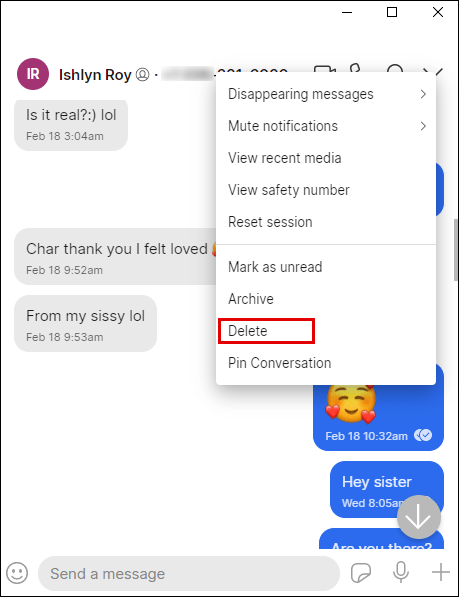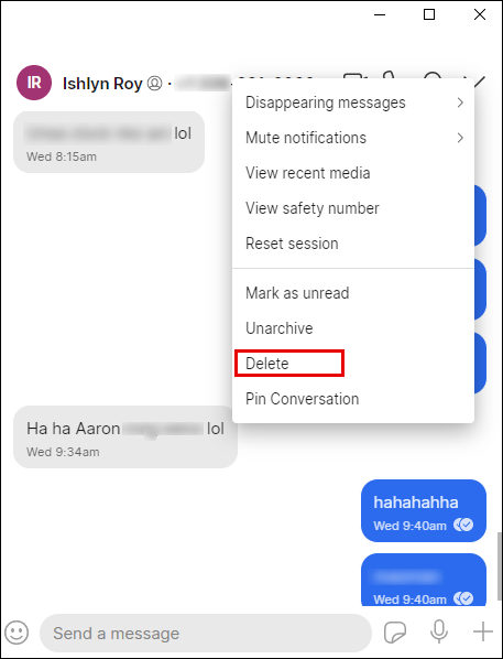 - Signal will ask you if you want to delete the selected conversation. Tap on “delete.”