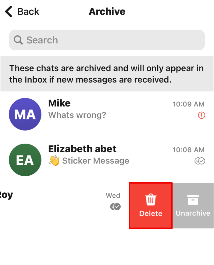 - Go to “Archived Conversations” at the bottom of your chat list.
