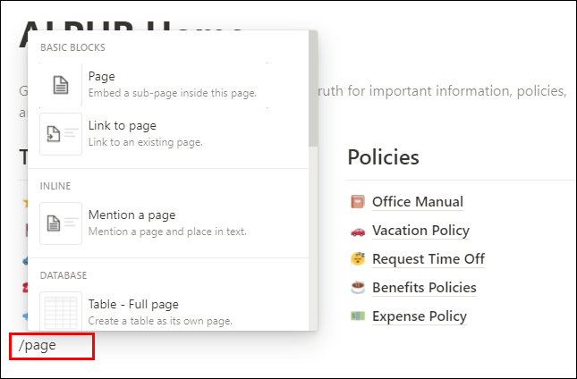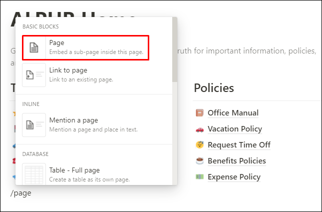 - Type “page” to trigger Notion to embed a subpage inside a page you’re currently on.
