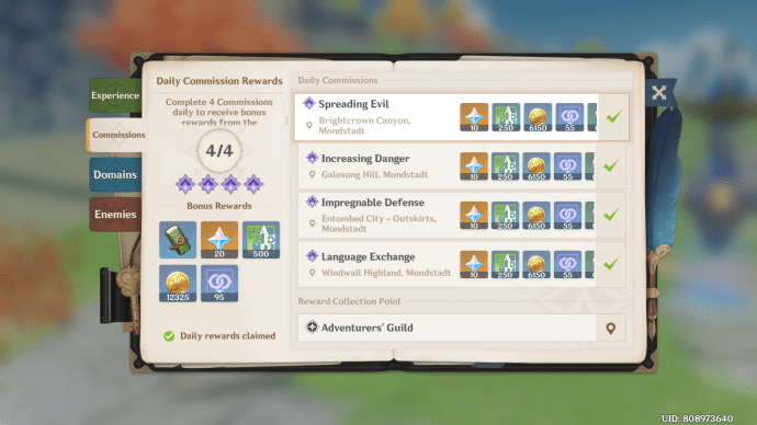 Are you finishing your Daily Commissions? Completing all four of them each day can yield around 20,000 Mora when you turn them in with Kathryn at the Adventurer’s Guild. You’re looking at a minimum of 3,925 per with a maximum of 5,950 per commission.
