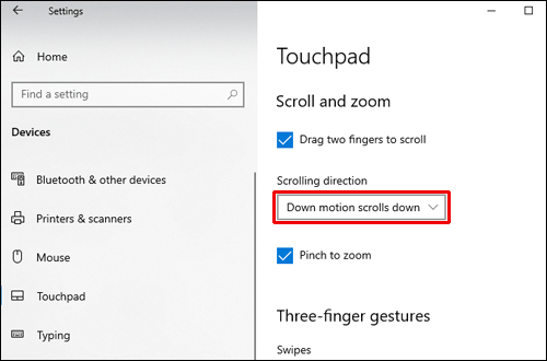 - If you’re using a Windows laptop, navigate to Settings, then to ‘’Devices,’’ and select ‘’Touchpad’’ from the menu. Under the Scrolling Direction section, click on ‘’Down Motion Scrolls Down’’ and select the inverted scrolling option.