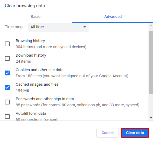 - Check the boxes next to “Cookies and other site data” and “Cached images and files.”