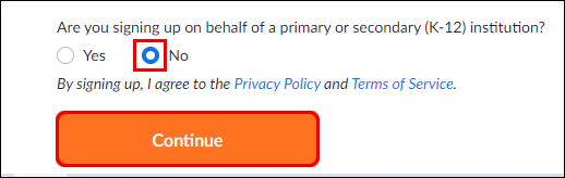 5. Next, you’ll be asked whether you’re signing up on behalf of a school. Click “No” if this isn’t the case, then “Continue.”