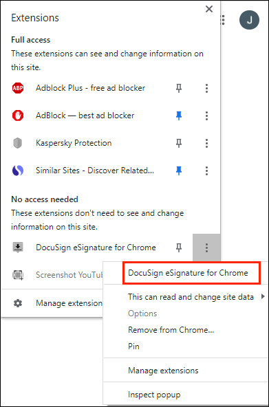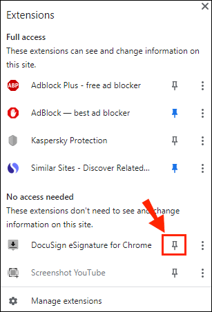 - A request to access will appear. To enable the extension, click “DocuSign eSignature for Chrome.”