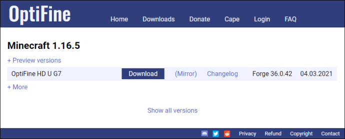 - Visit the OptiFine website and install it on your device. To find the 1.8 version, click “Show all versions,” then find the one you need and click “Download.”