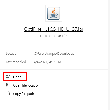 2. Find the Optifine launch file on your PC and copy it using a keyboard shortcut.