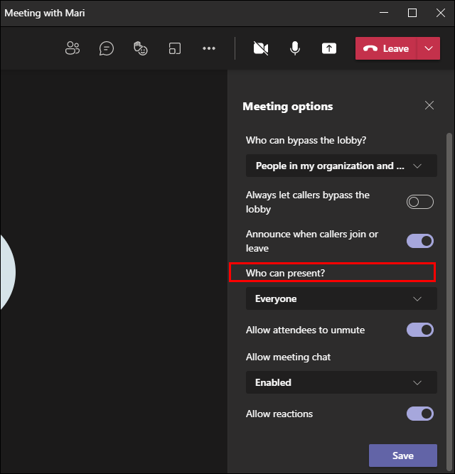 - From the dropdown menu, select “Who can present?” and choose the new presenter.