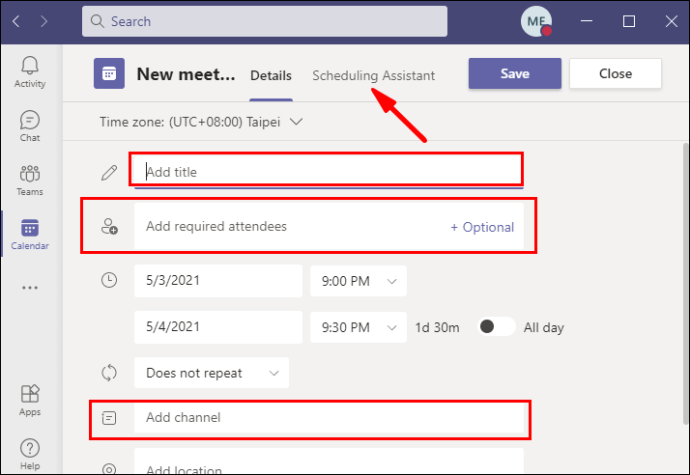 4. Give your meeting a title, select the people you’re inviting, and add all the meeting details, such as the channel you’ll be using and the topic of conversation. You can access Teams’ “Scheduling Assistant” to get more help with the process.