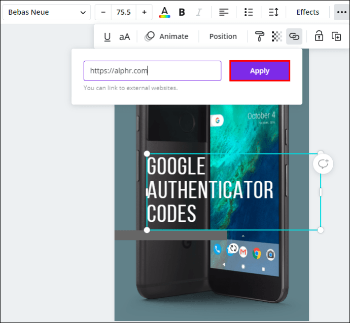 Note: If you don’t see the link icon, then go to the three dots in the upper-right corner of your screen, and then you’ll see the option to add a link to your design. - Enter the link in the box.