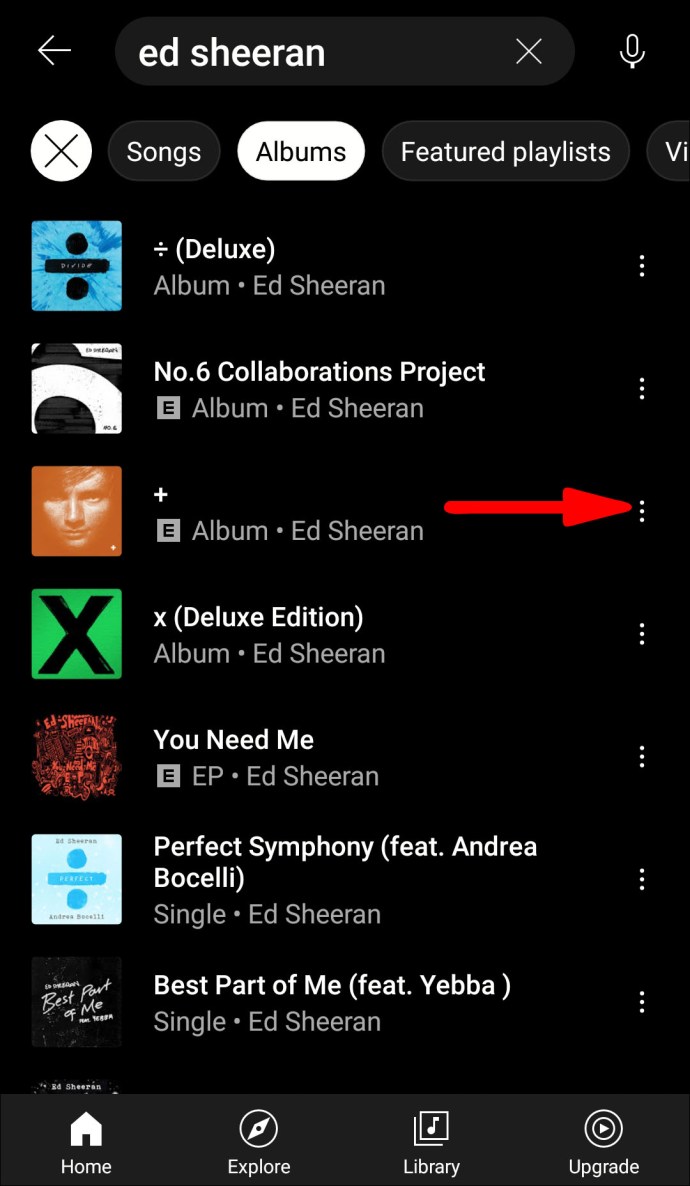 - From the search results, tap on the menu button next to the album.