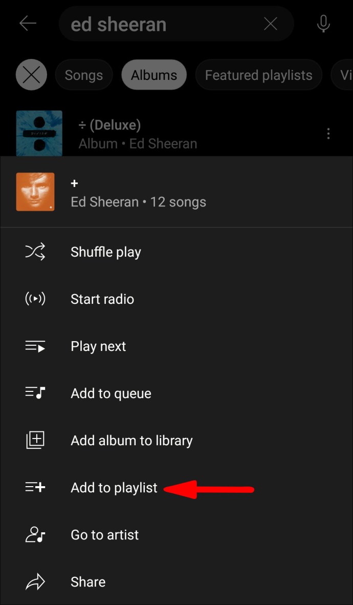 - Search for the album you want to add to a playlist. Tap on the “Album” tab to narrow down your search if necessary.