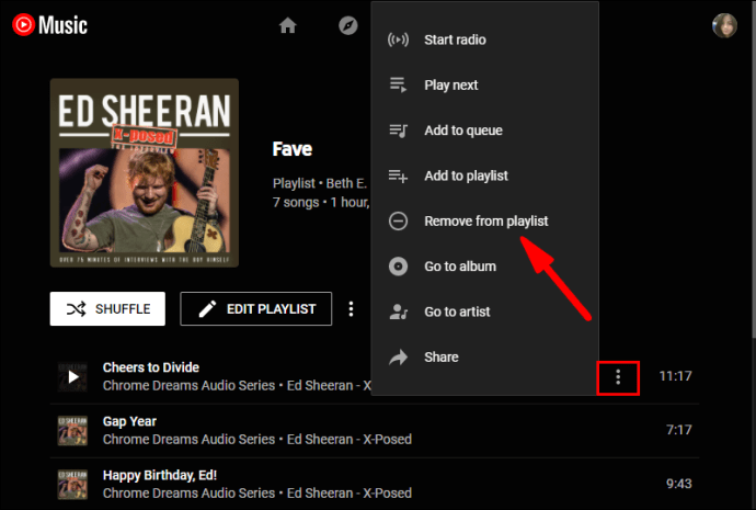 - Then, click on the three vertical dots next to the song, and from the menu, select “Remove from playlist.”
