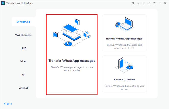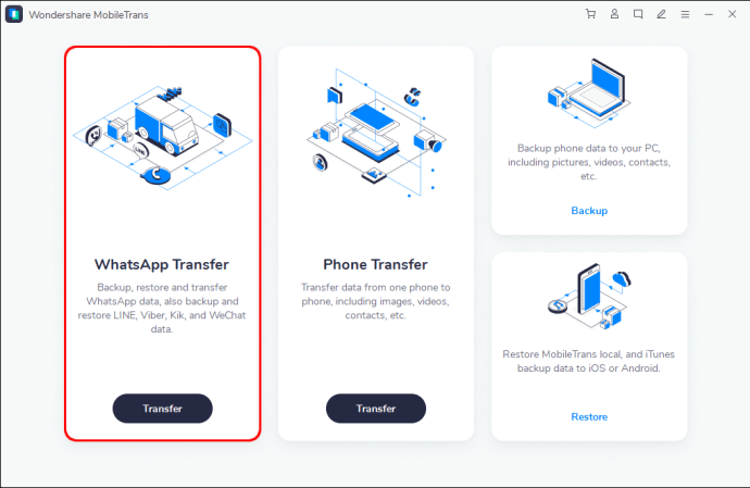 - Open the app and press “WhatsApp Transfer.”