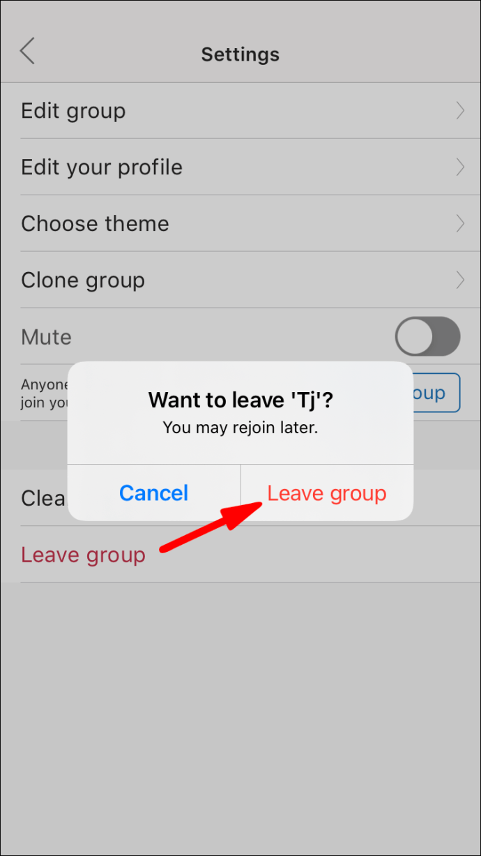 • Hit “Leave Group” and tap “Leave Group” again to confirm your decision.