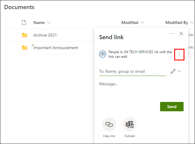 - Click on the downward arrow to open a drop-down menu. Select one of the link-sharing options.