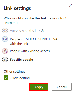 - Choose a sharing option from the drop-down menu. Click “Apply” to create the link.