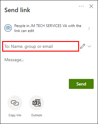 - A new window will open. Type the name of the person or group you want to add to the site. You can also share the site with the entire organization. Just type “Everyone Except External Users” in the dialog box.