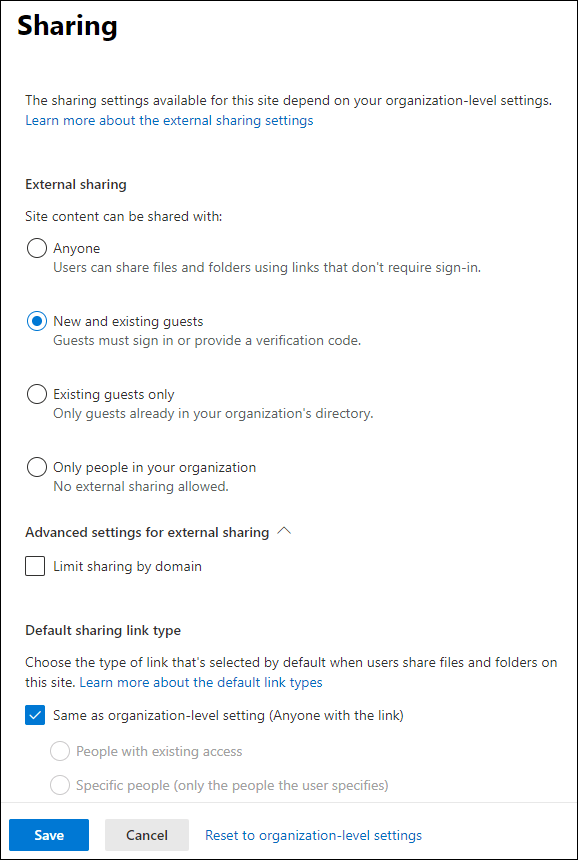 There’s a preferred sharing setting for each situation and link type. Global and SharePoint admins can even enable external sharing and manage the Guest settings for the entire organization.