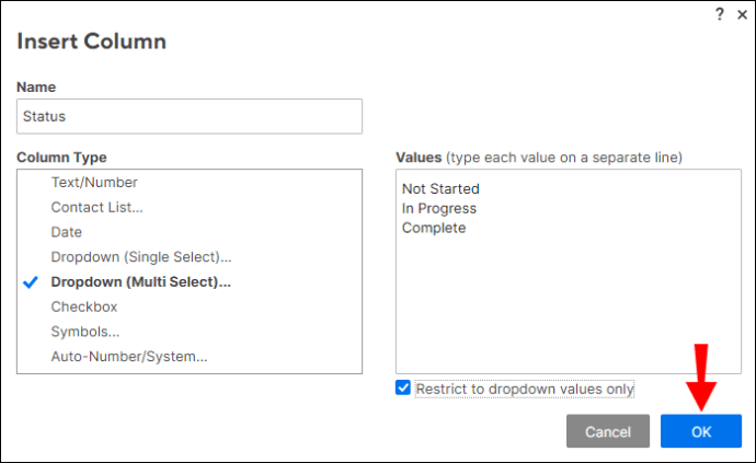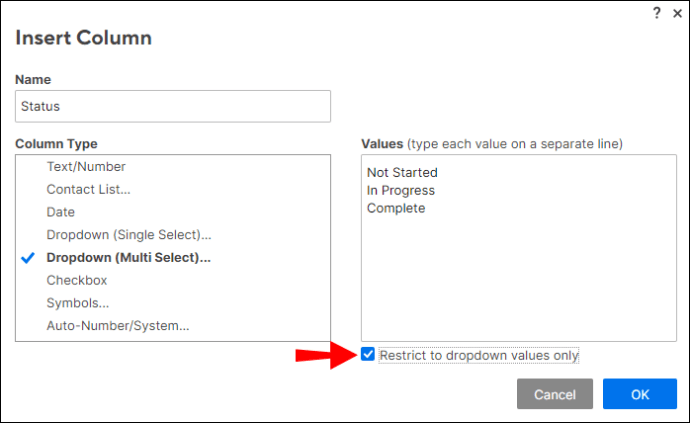Note: If you choose “Single Select,” you can only pick one value, but if you choose “Multiple Select,” you can type in as many values as you want. Just remember to separate them with the “Enter” key or “Return” key on your keyboard. - Check the “Restrict to dropdown values only” box if you want to prevent other users from entering free text values.