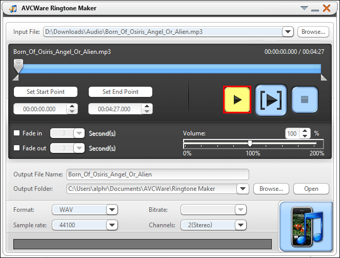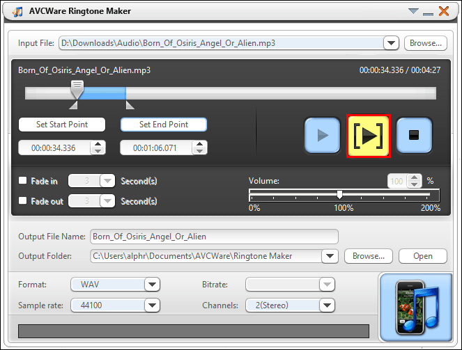 - Click on the “Play” button to hear your file and decide which section you’d like to create your ringtone from.
