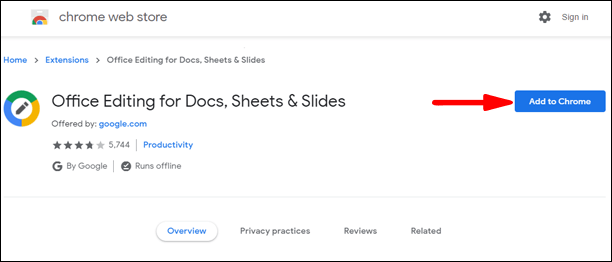 - Start typing “Office Editing for Docs, Sheets & Slides” in the search bar and click on the first result. It will take you directly to the Chrome Web store.