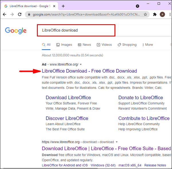 - Start typing “LibreOffice download” and select the first link, or use this link: https://www.libreoffice.org/download/download/.