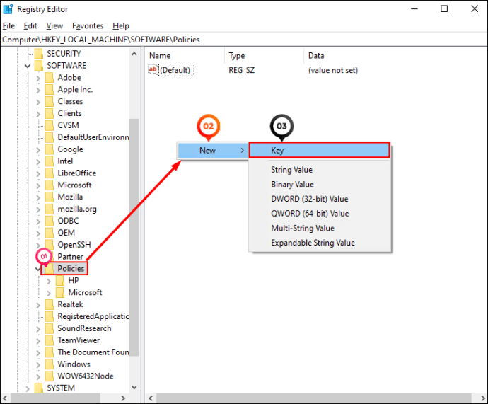 - You’ll now need to create a Chrome folder under “Policies.” To do so, position your cursor anywhere inside the blank space to the right of the registry. Then right-click and select “Key” from the context menu.