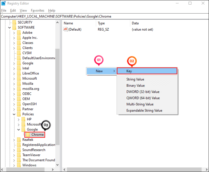 4. Create a “Chrome” key under “Google” (Skip steps 3 and 4 if you have already created a Chrome registry).