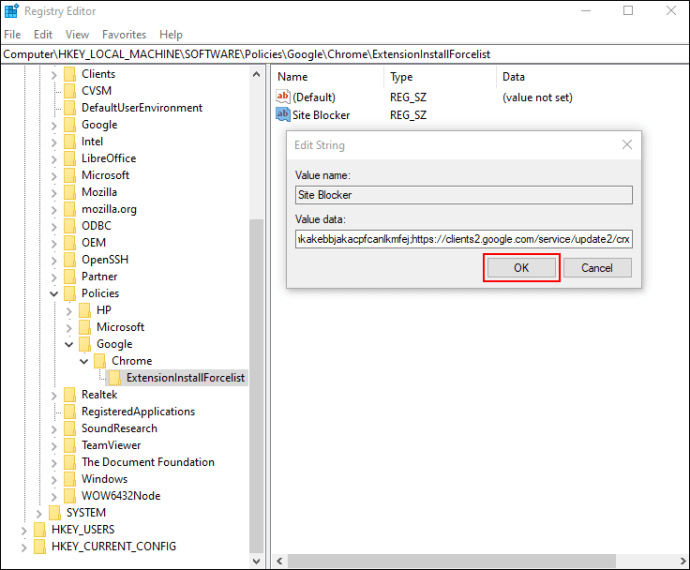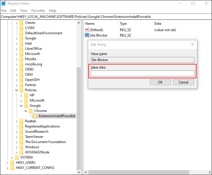 Step 5: Paste the extension’s string (created in step 2) in the field named “Value data:”