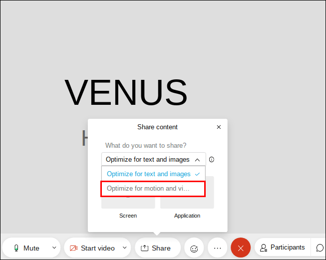 - Share your audio so that your colleagues will be able to hear the video.