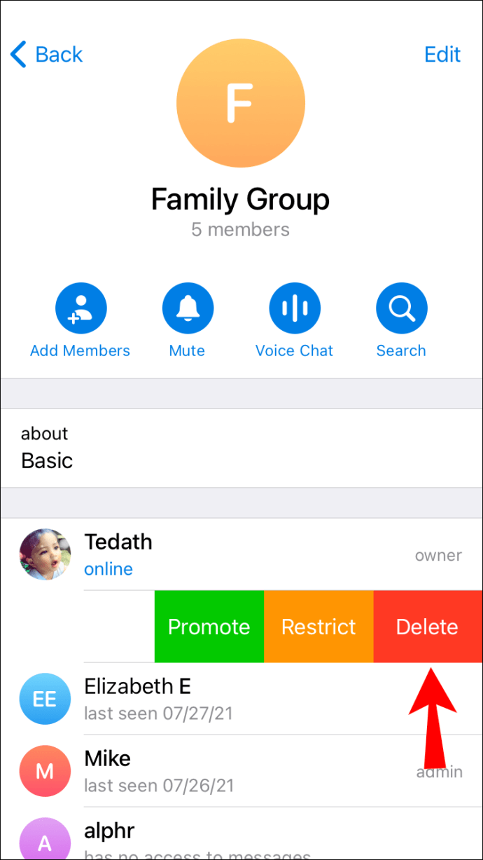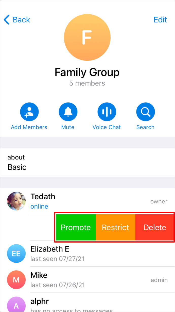 - Long tap on the user’s name. You should see a pop-up window with three options: “Promote,” “Restrict,” and “Delete.”